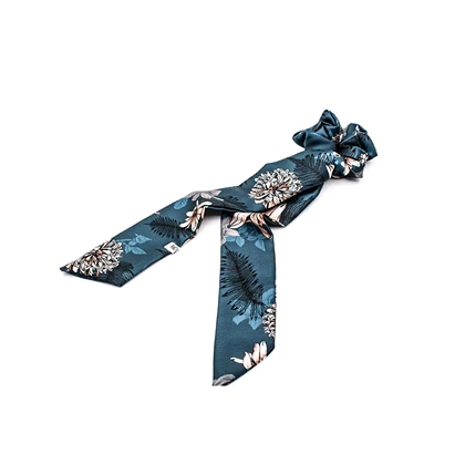 Scrunchie φιόγκος για τα μαλλιά από εμπριμέ τεχνητό μετάξι με botanical flowers pattern σε petrol-black χρωματισμούς.