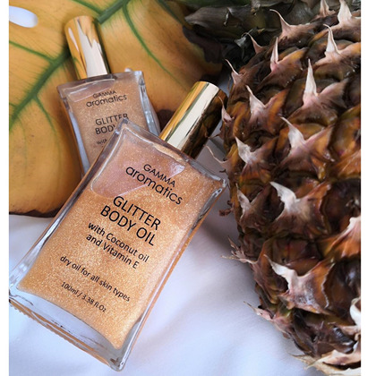 Ξηρό glitter λάδι σώματος με άρωμα καρύδας και coconut oil για ενυδατωμένο και απαλό δέρμα. Επιπροσθέτως, περιέχει βιταμίνη Ε για αντιοξειδωτική προστασία.