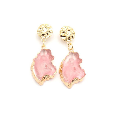 Σκουλαρίκια με καρφάκι, σε χρυσό χρώμα διακοσμημένα με απομίμηση ημιπολύτιμης πέτρας από ρυτίνη σε ρπζ χρώμα.