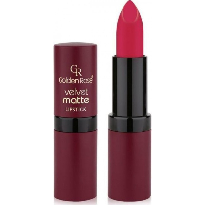 Η Velvet Matte Lipstck σειρά της GOLDEN ROSE είναι ασυναγώνιστη τόσο για τα ματ χρώματα της όσο και για την βελούδινη υφή της στα χείλη σας!Περιέχει Βιταμίνη Ε και άλλους ενυδατικούς παράγοντες που θρέφουν και ενυδατώνουν τα χείλη σας. Η νέα σύνθεση της χαρίζει επιπλέον διάρκεια και άκομα πιο έντονα και ελκυστικά χρώματα που θα λατρέψετε!Διαθέσιμη σε 38 μοντέρνους χρωματισμούς. Δερματολογικά Ελεγμένο, paraben free, gluten free, cruelty free.